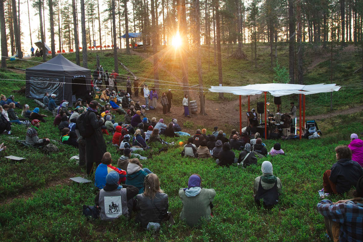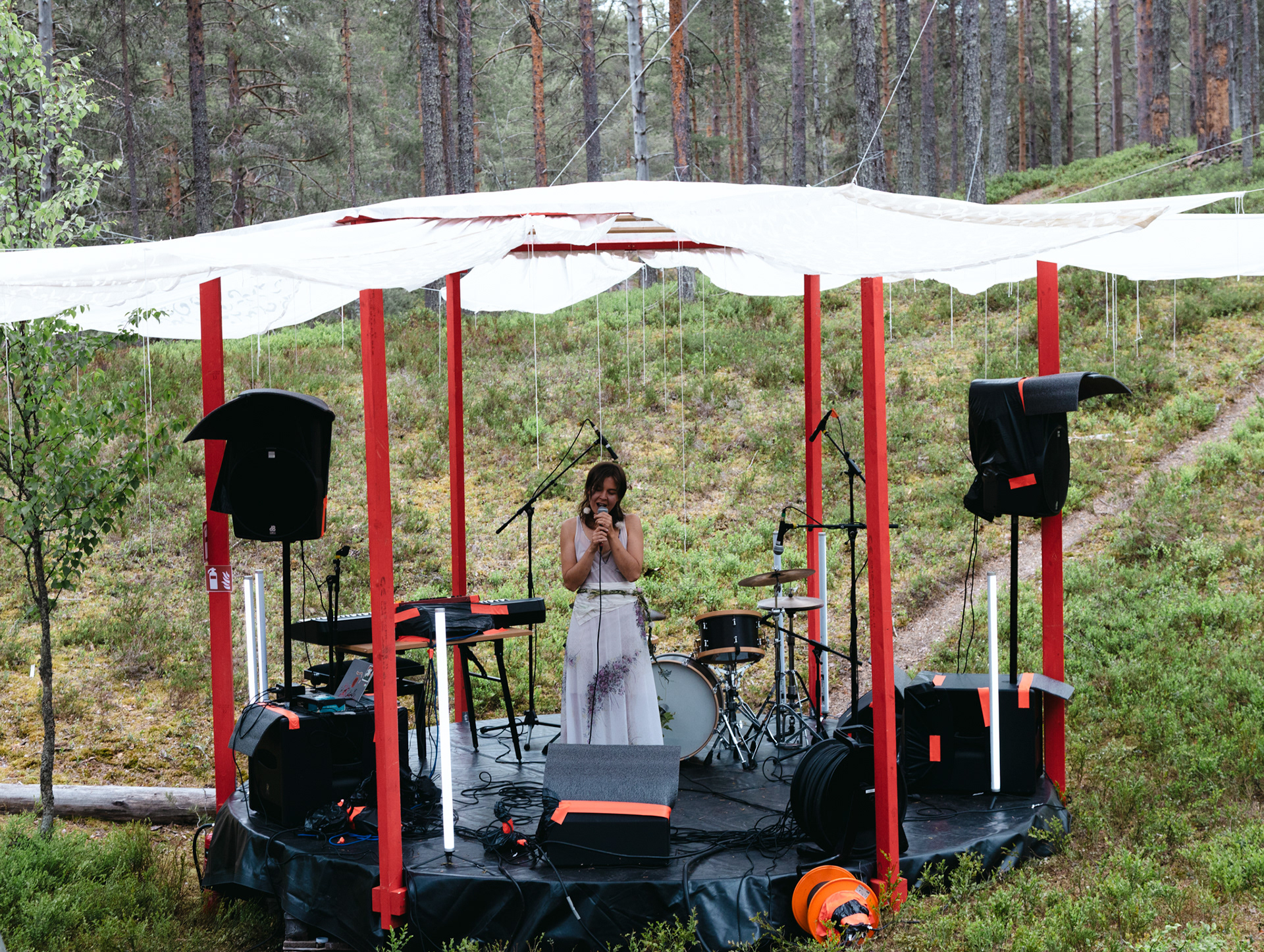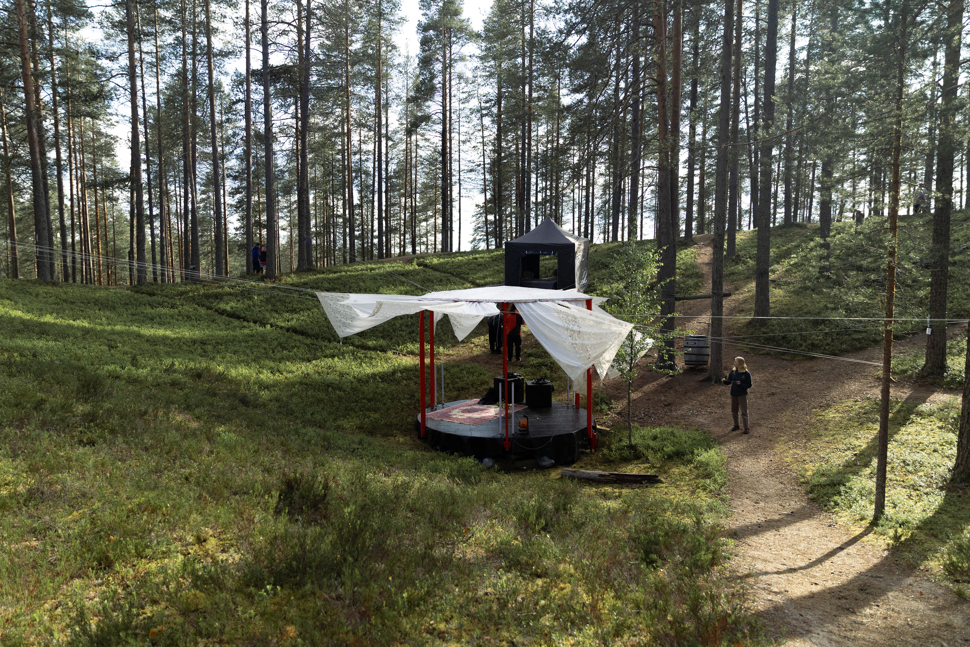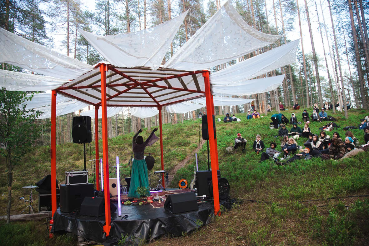 360-degree main stage design and construction for Soiva Metsä art festival, Suomussalmi, Finland. Like petals of a flower, the stage opens and closes according to weather and light.